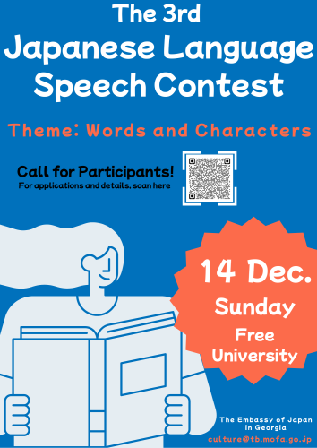 The Embassy of Japan in Georgia will hold the 3rd Japanese Speech Contest at Free University of Tbilisi on 14 December (Sunday), 2025. This Contest offers participants an opportunity to present the results of their daily Japanese language studies. It is also aimed at deepening understanding of Japan through interaction between Japanese learners and giving motivation for further Japanese language studies.