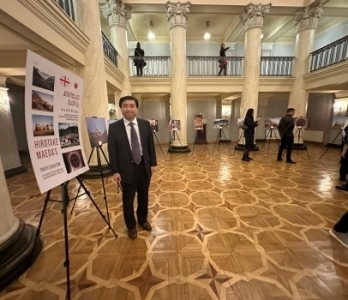 石塚大使による前田弘毅・東京都立大学教授(ジョージア学専門)の写真展「コーカサスとコーカサスの世界を探求して 1995-2015」開会式への出席