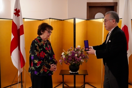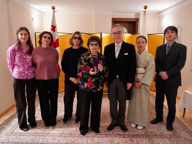 Ambassador Ishizuka appreciated Ms. Gogoberidze’s outstanding contributions to promoting cultural exchange and mutual understanding between Japan and Georgia and transferred the decoration and its diploma to her. Ms. Gogoberidze then expressed her heartfelt gratitude.